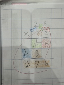 こちらが用意したのは、見えやすいように手順と書く場所の色を統一する、繰り上がりの数字の書く場所も毎回違ったため、掛け算すべきところで足し算なども見られたため、