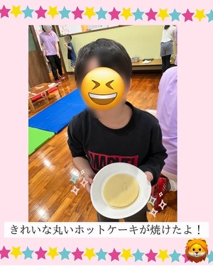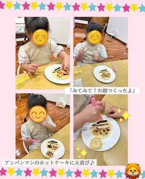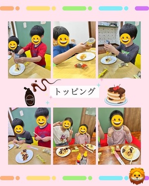 チョコソースやシロップをかけてトッピングのお菓子を乗せて、甘い甘いおやつ時間となりましたが、子ども達は自分でホットケーキを作れたことがとても嬉しそうでした✨