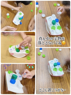 ※見守っていた職員も楽しく参加できました。宝物はなかなか落ちませんでしたが、周りのキャップが落ちるスリルを子ども達は楽しんでいました。チーム戦で行いましたが、1対1で遊ぶのも楽しい!一人でキャップ乗せるのも楽しい!と、遊び方を発展させていまさた✨わくわくな活動ありがとうございました^_^