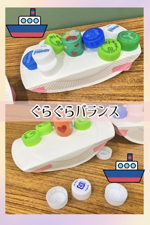子ども達がルール理解して上手にバランスよくキャップが置けた。「ドキドキわくわく」しながらゲームしていた。