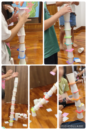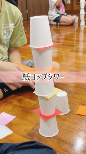 とても集中して楽しく遊んでいました。ゲームに勝ちたい気持ちが強く、声や態度が大きくなってしまい、紙コップが倒れることもありました。